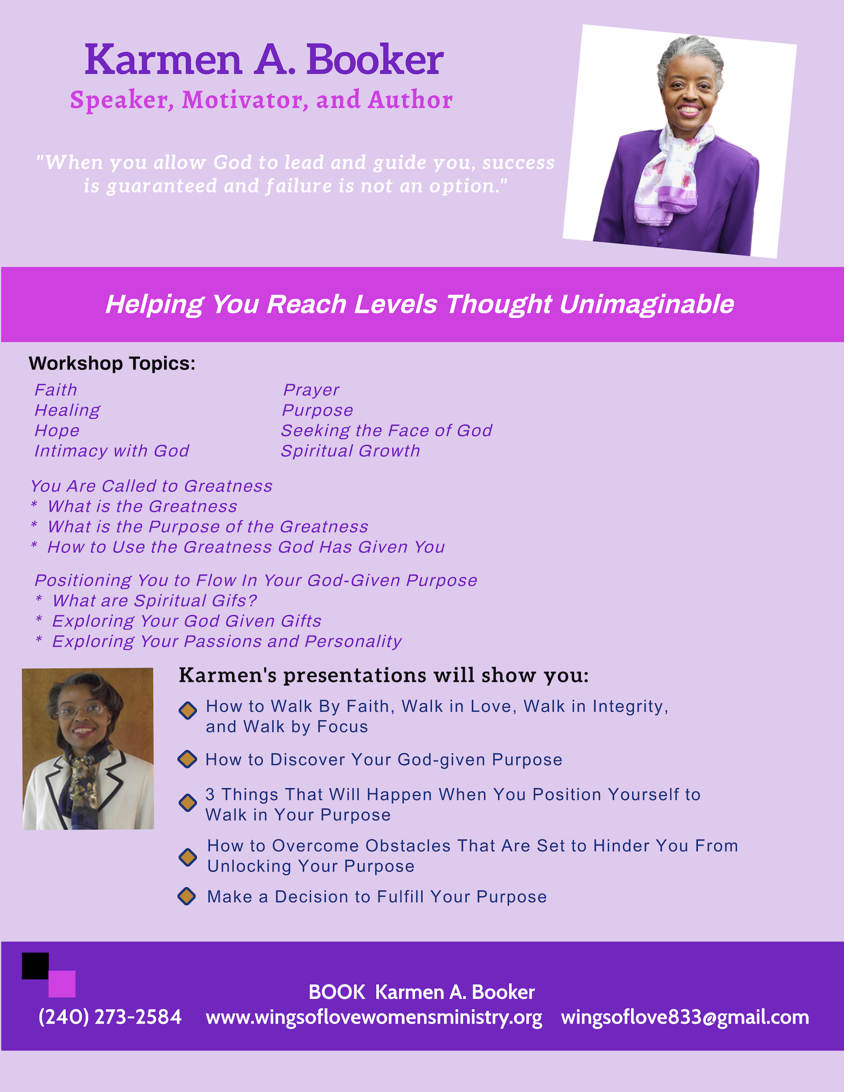 Get in touch Contact Karmen A. Booker is available for speaking engagements, seminars and workshops, and more. Please contact her to learn more! Maryland Minister Karmen A. Booker (240) 273-2584 wingsoflove833@gmail.com Main Contact FormFirst NameLast NamePhone NumberEmailSubjectYour MessageSubmit Form Connect With Us!